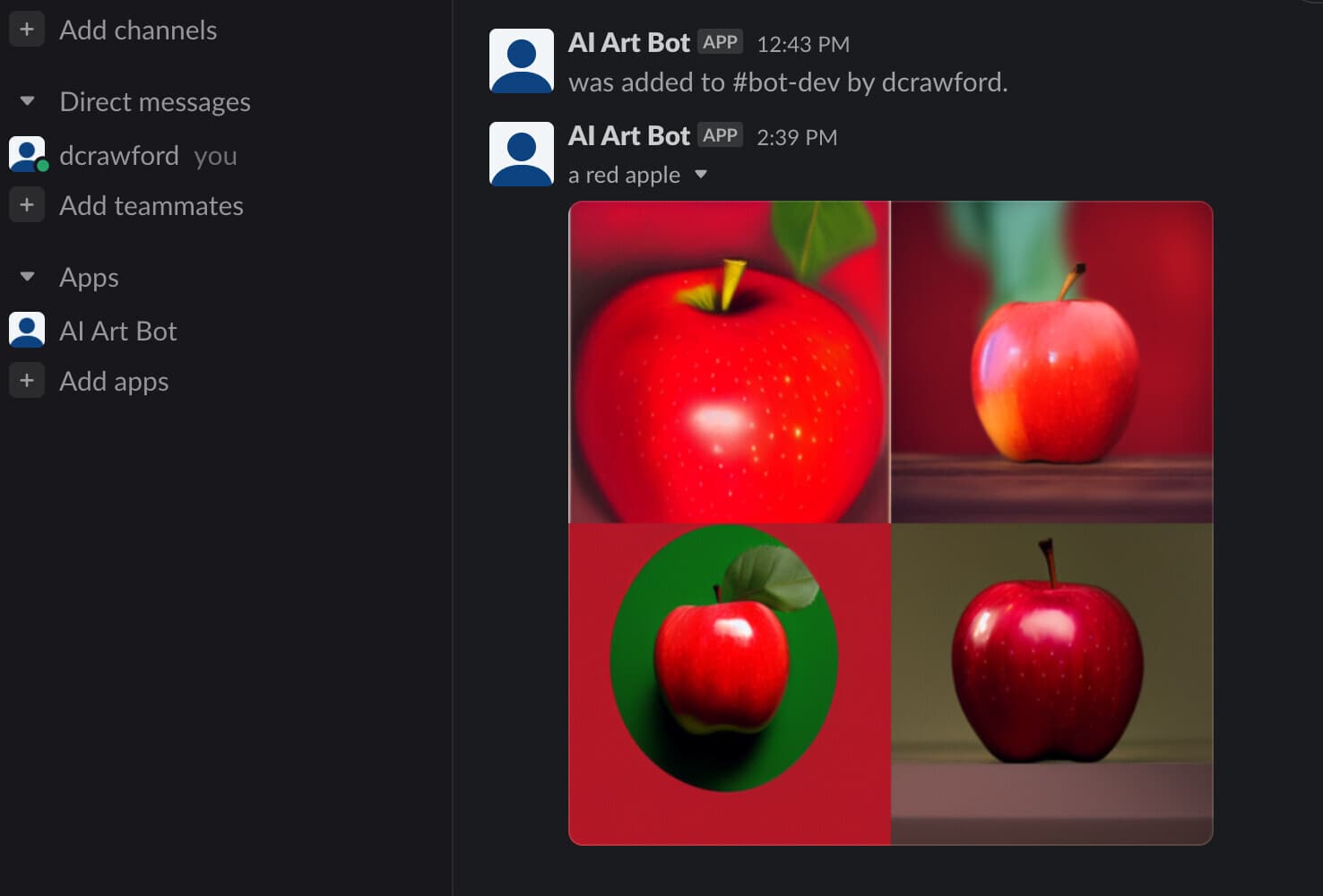 AI art generation has been exploding in the last year, and the once difficult to manage tools are now incredibly easy to use, modular, and versatile. Last year I created a Discord bot that generated AI art from my own privately hosted DALL‑E 2 public model. This was quite cumbersome to setup, and it wasn’t very flexible if I wanted to make small changes. After exploring what’s changed in the last year, I can confidently say that all of my pain points have been resolved by the latest iteration of art generation: Stable Diffusion. In this post, I wanted to share how easy it truly is to create your own AI art generating Slack bot. I chose Slack this time, because at MichiganLabs we use Slack as our communication tool, so it’s a little more relevant to our own work. But there is a lot of overlap between Slack and Discord, if you’re using their respective Typescript libraries. With that said, start your timer, because this should only take about 10 minutes (as long as your internet speed is fast enough!).
